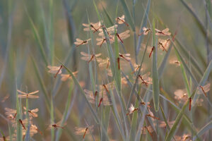 “Nach einem langen Fototag im Rheindelta am Bodensee war ich mit dem Fahrrad auf dem Heimweg. In einiger Entfernung sah ich in Richtung untergehender Sonne vermeintlich tausende von Mücken. Mit dem Fernglas wurde mir erst klar, daß es sich um Libellen handelte. Damit war der Tag doch noch nicht gelaufen. An Ort und Stelle packte ich meine Fotoausrüstung wieder aus und fotografierte, bis die Sonne untergegangen war. Bei dieser Masse von Libellen konnte ich mich nur schwer auf einen entsprechenden Ausschnitt konzentrieren.”